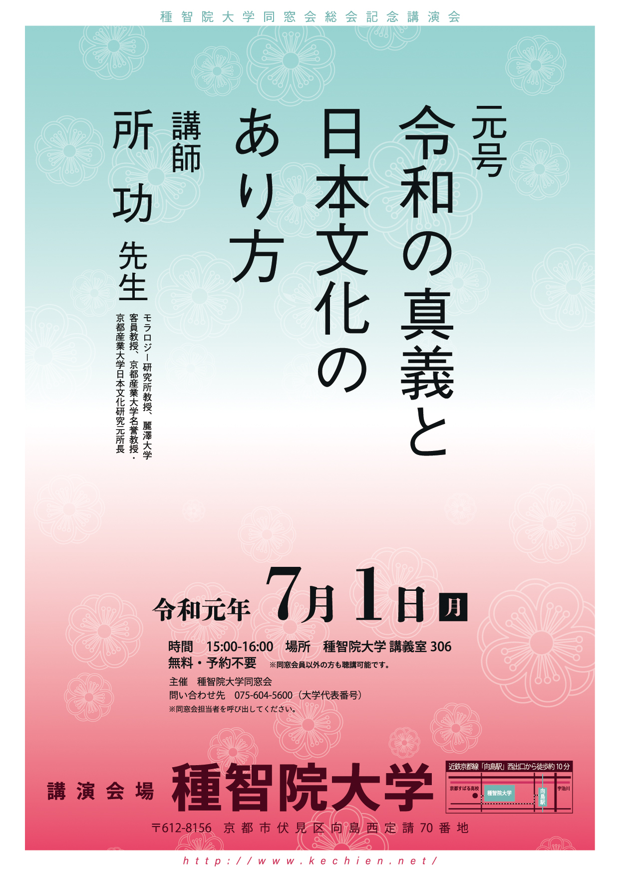 | 15:00 | 記念講演 | 3階講義室306 講師 所 功 (ところ いさお) 先生 モラロジー研究所教授、麗澤大学客員教授 京都産業大学名誉教授、同大学元日本文化研究所長 演題 「元号令和の真義と日本文化のあり方」 ※一般の方のご来聴も歓迎・無料 |